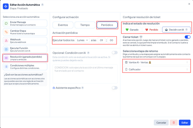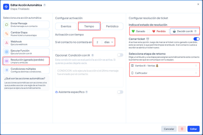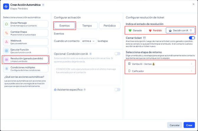 Este método se utiliza cuando quieres que una etapa específica del embudo determine automáticamente si un ticket debe considerarse ganado o perdido, sin necesidad de configurar acciones automáticas adicionales. Una vez marcada como “Ganada” o “Perdida”, cualquier ticket que llegue a esa etapa se resolverá de inmediato según el tipo elegido.
