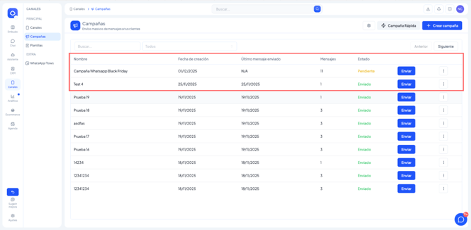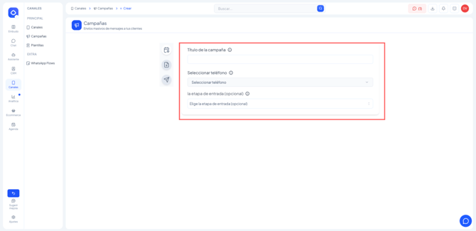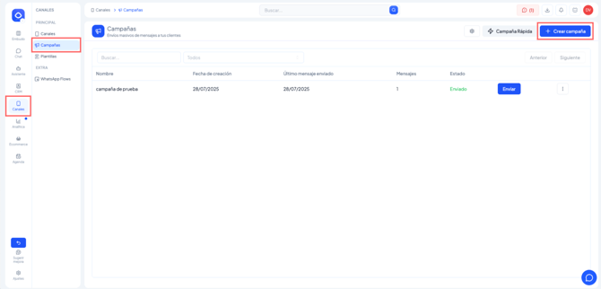En la barra lateral izquierda, ingresar a Canales y luego en Campañas.