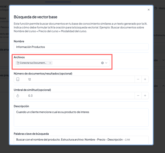 Los documentos deben estar previamente cargados en la Base de Conocimiento.
