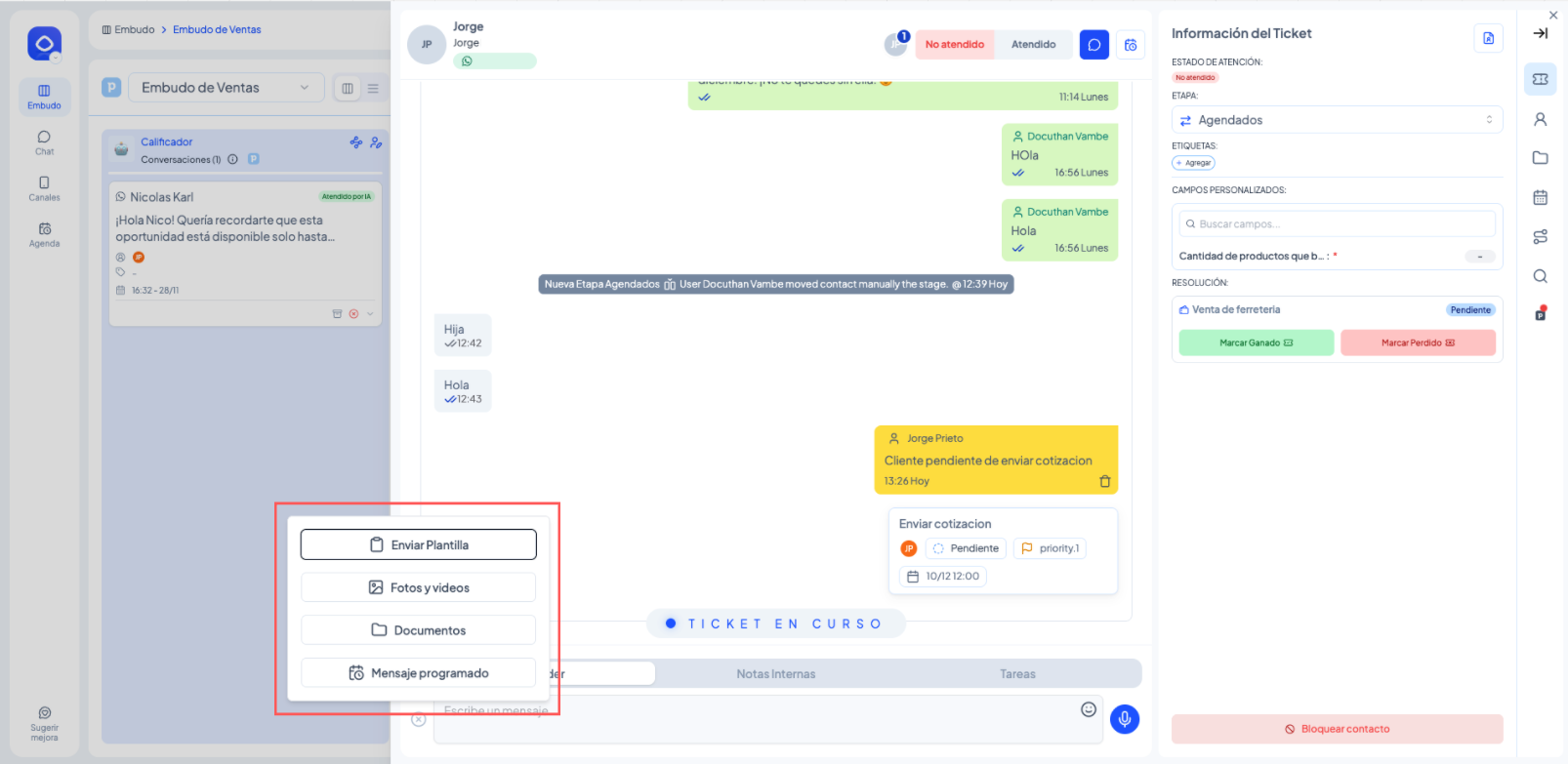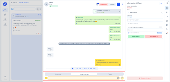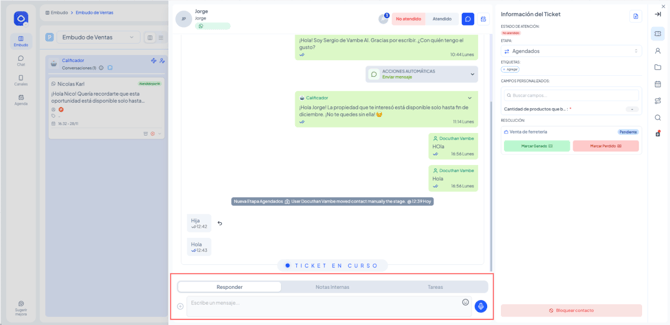 Este artículo explica cómo un agente puede responder mensajes, dejar notas internas y gestionar tickets dentro de un embudo. Está diseñado para cualquier usuario del equipo que atiende contactos en etapas humanas.