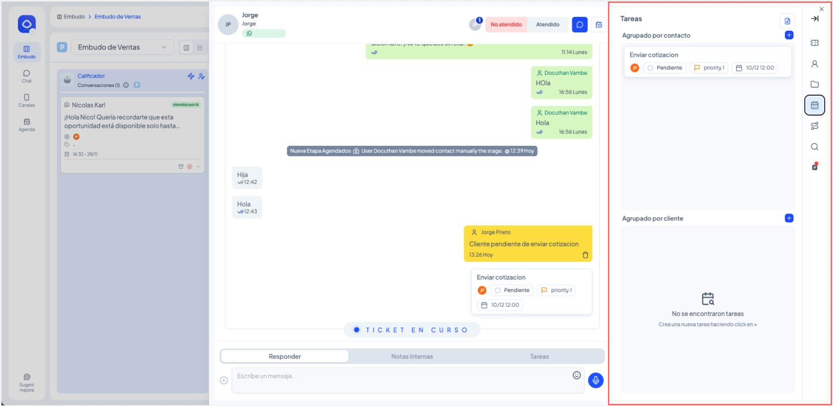 Las tareas permiten ordenar el flujo de trabajo sin afectar la conversación con el cliente.