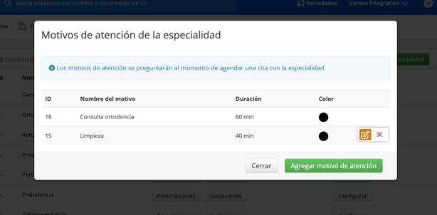 Dentro de esta vista, verás los motivos de atención asociados a esa especialidad.