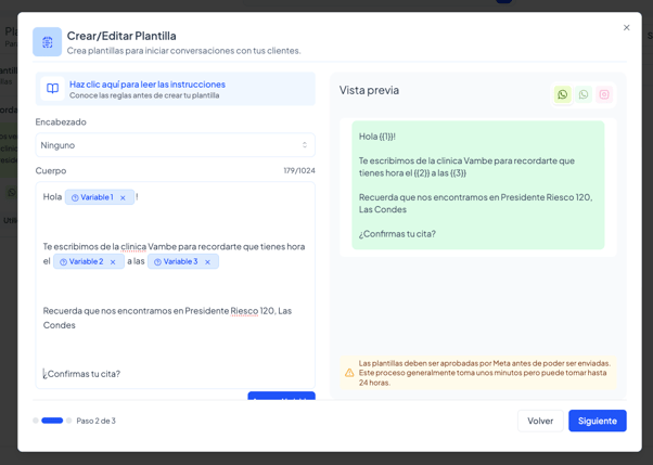 Al momento de crear las plantillas de confirmación y recordatorio, asegúrate de incluir variables que Vambe pueda completar automáticamente, por ejemplo: